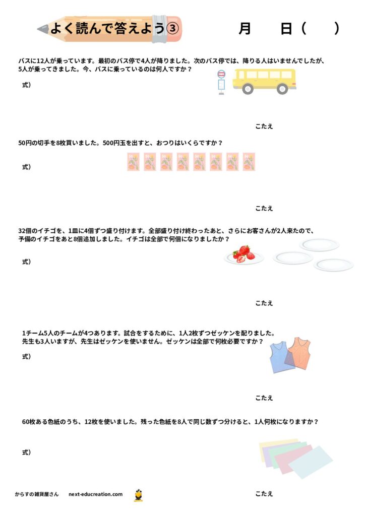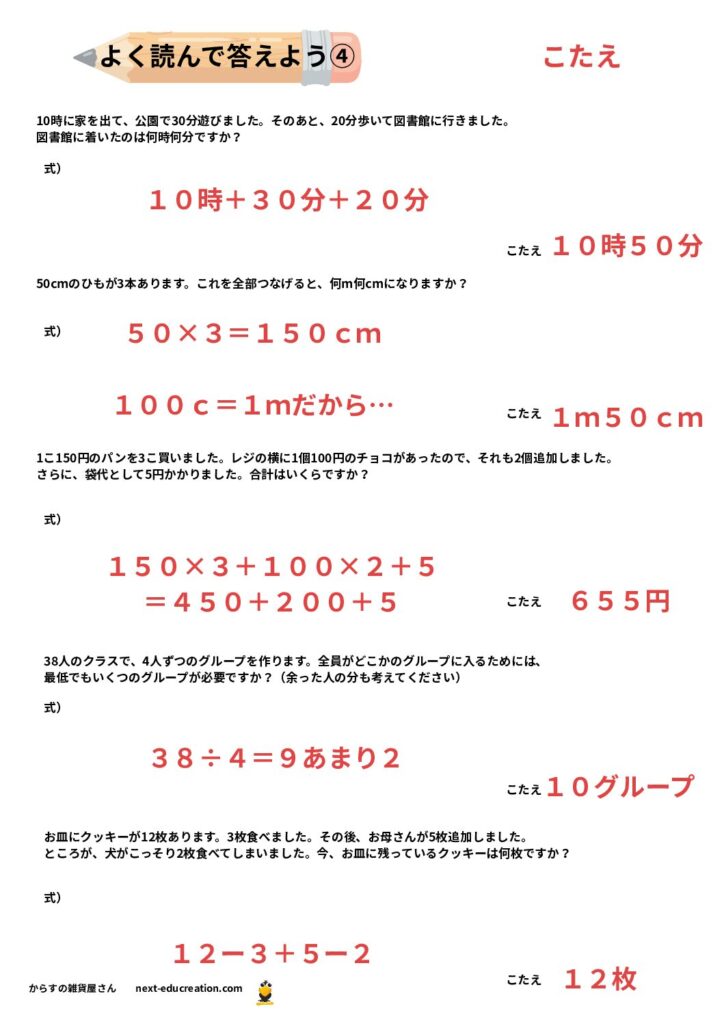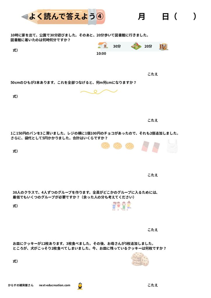 文章題は日常のシーン(買い物、時間の計算、分配など)をシミュレーションしたものが多いため、実生活に直結します。