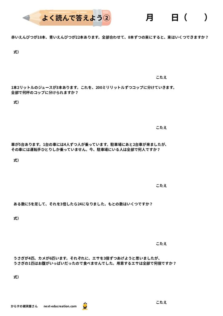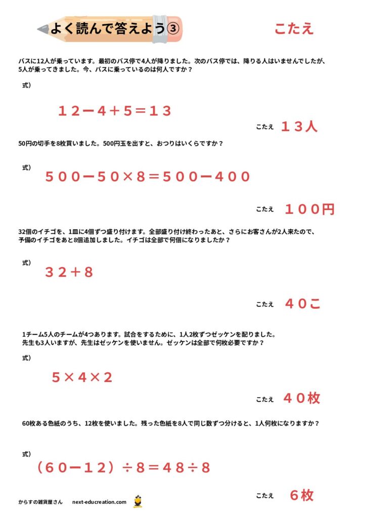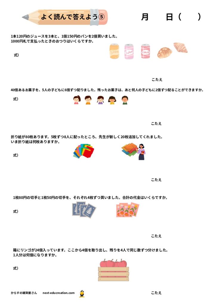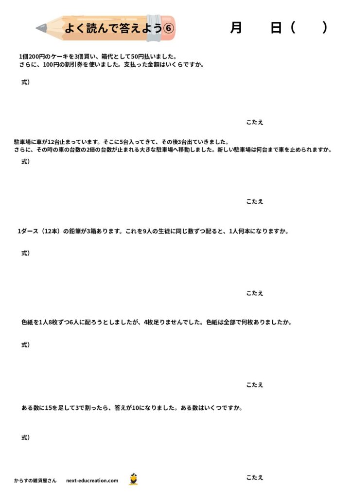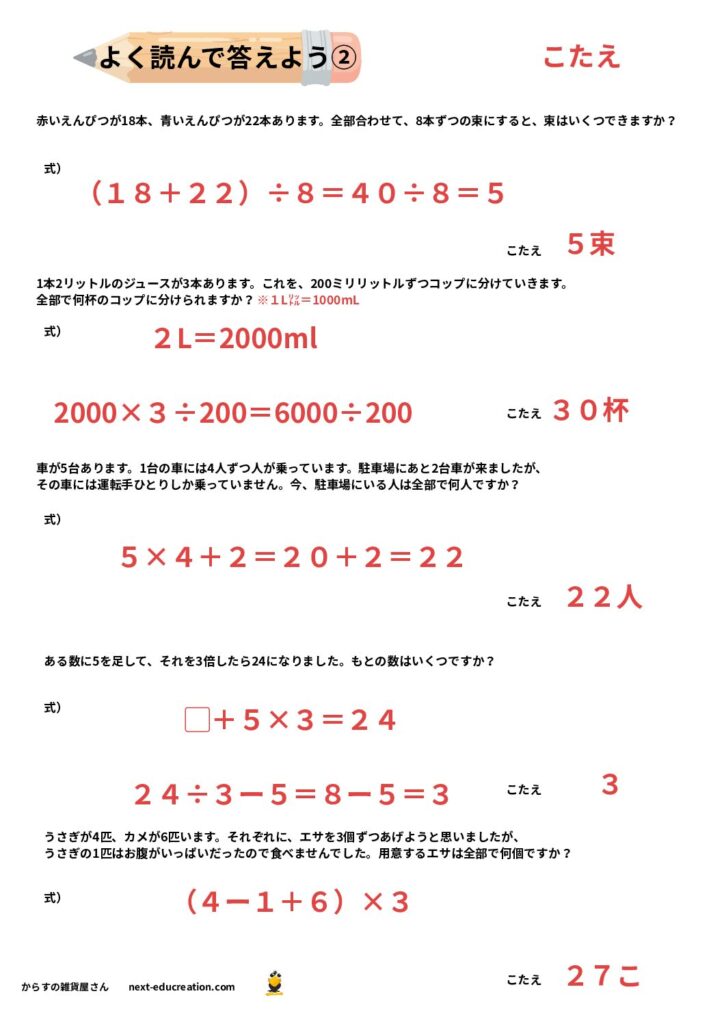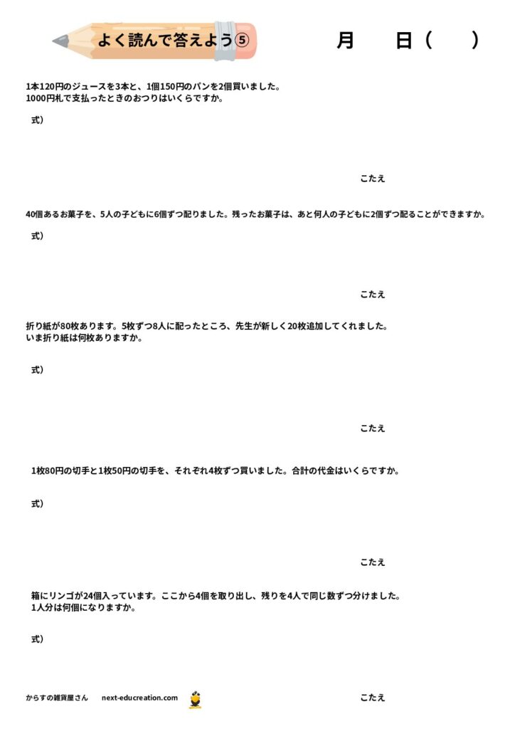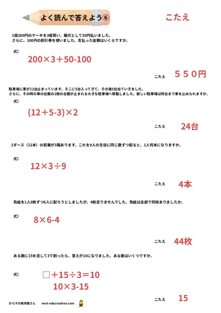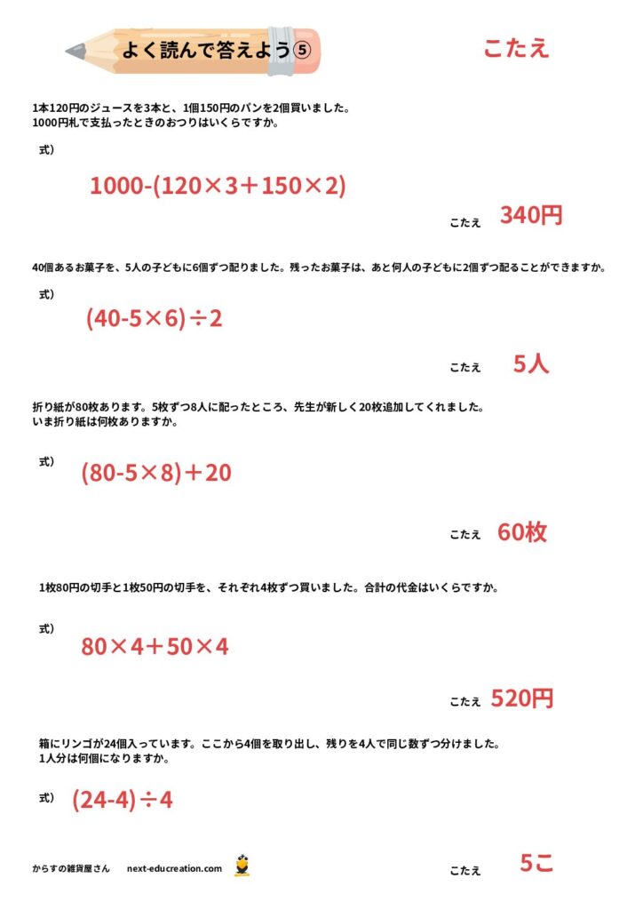このページで紹介するのは、四則演算(+、−、×、÷)が混ざった文章問題です。