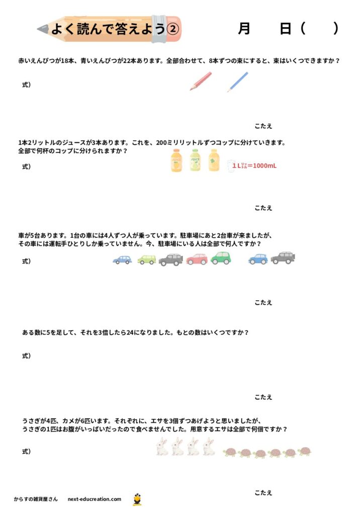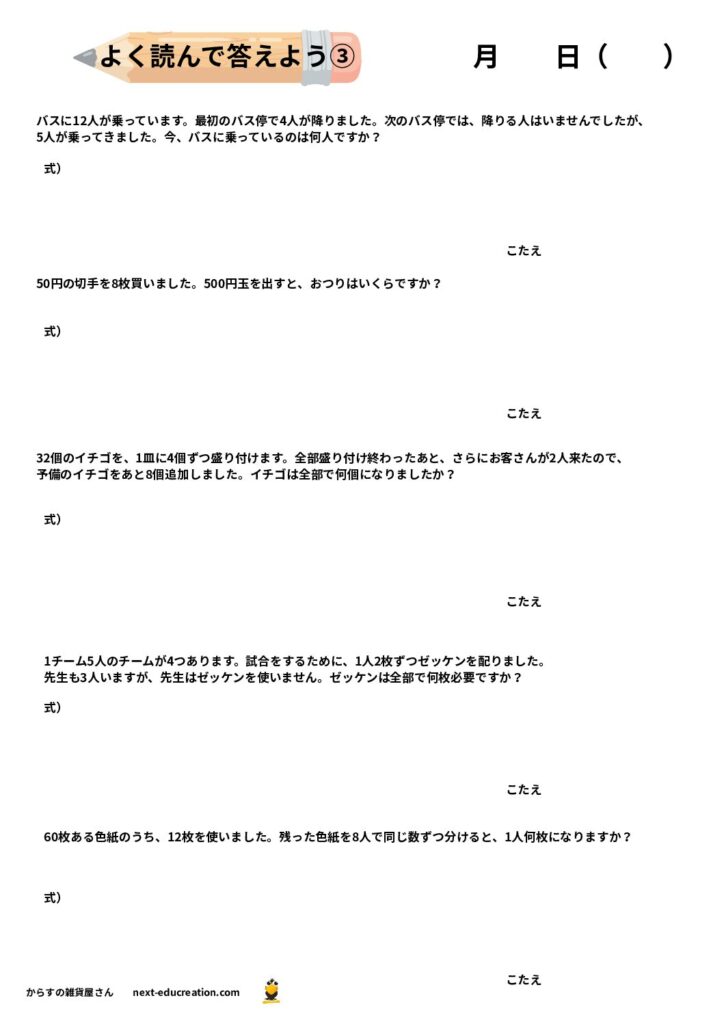 - 読解力の向上: 「合わせて」「残りは」「〜倍の」といった語彙を、算術的な意味に結びつける訓練。
