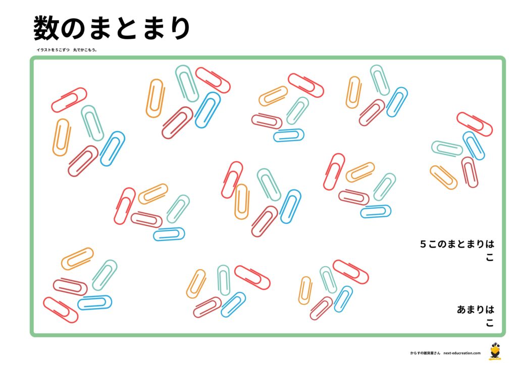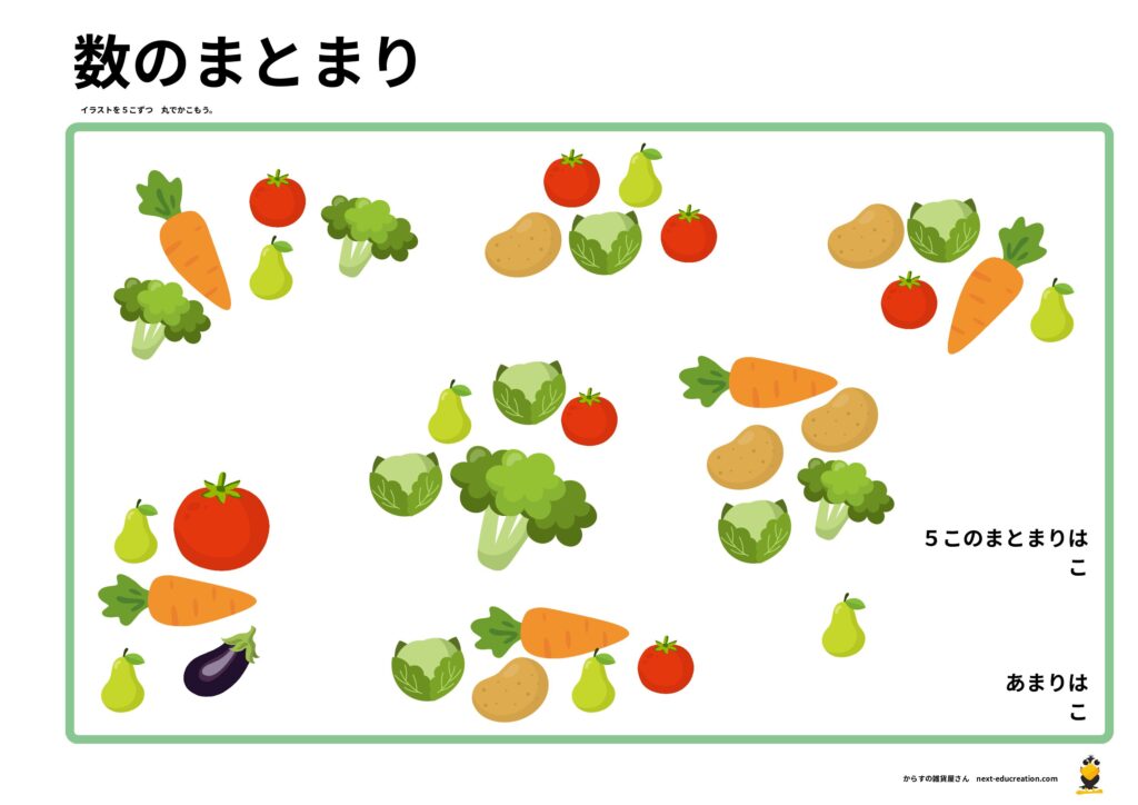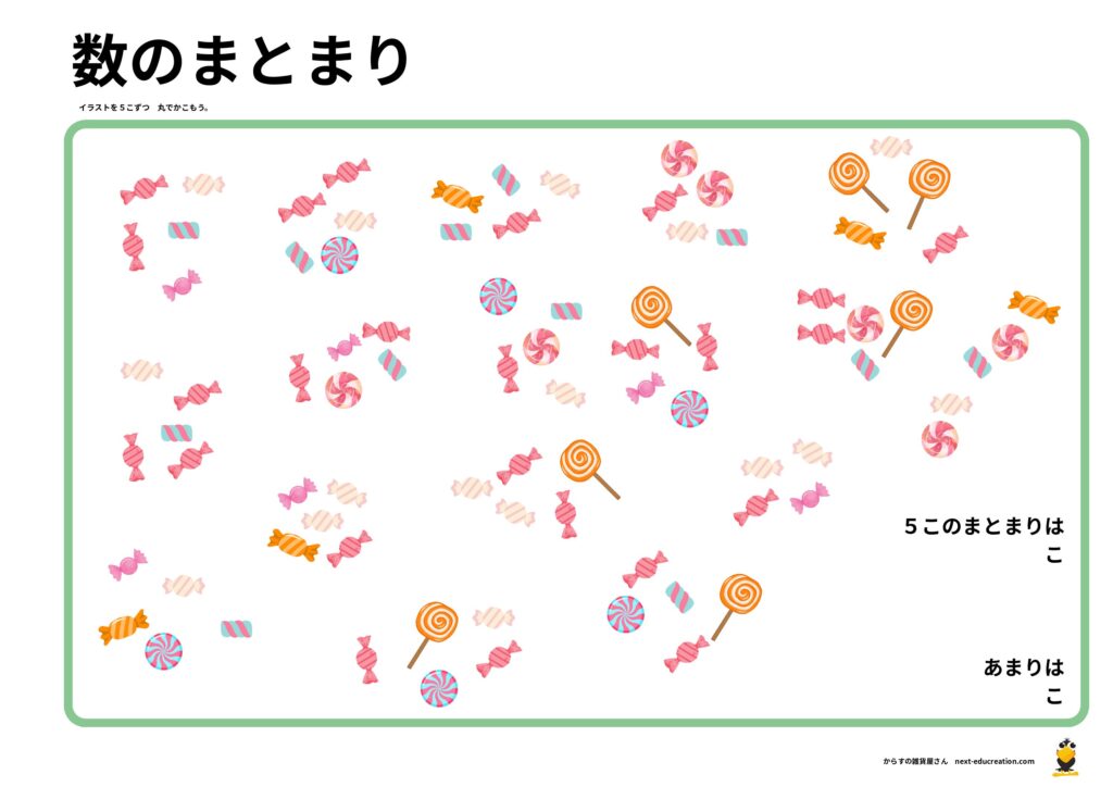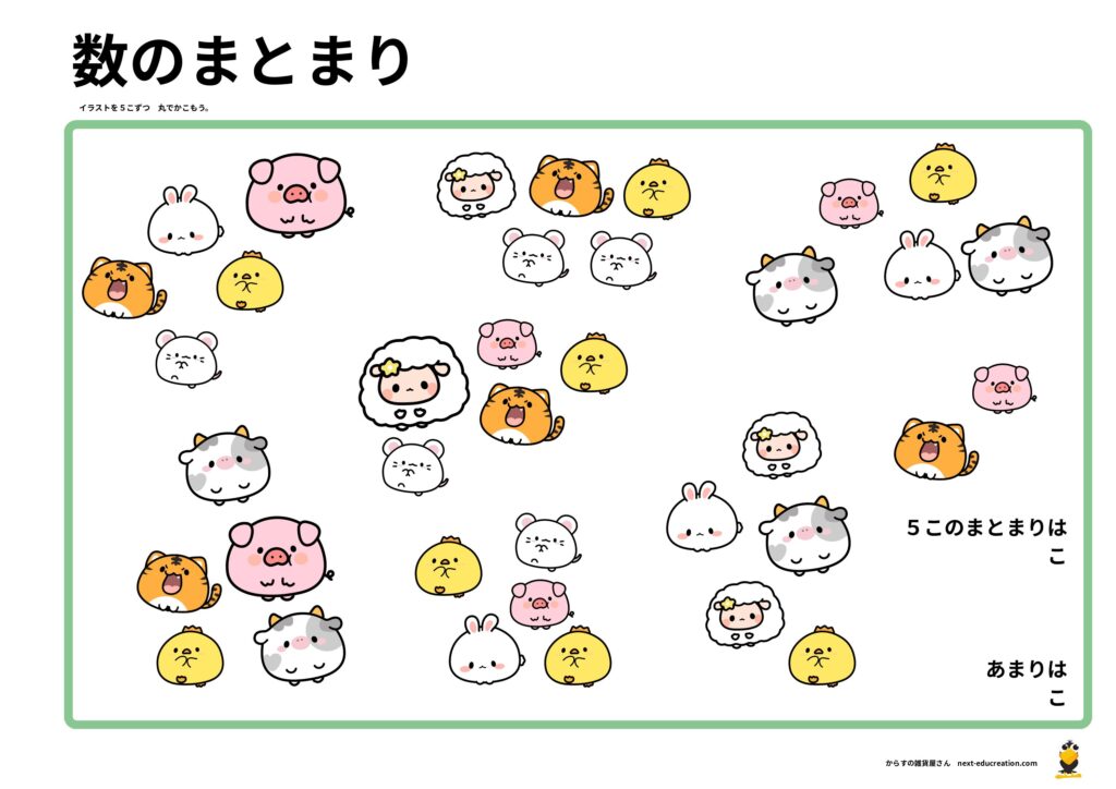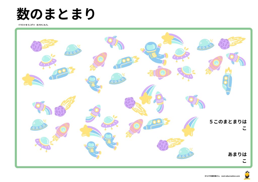 ただ1つずつ数えるのではなく、イラストを「5個ずつ丸で囲む」ステップを挟むことで、数え間違いを防ぎ、位取りの基礎となる「まとまりの意識」を育てます。